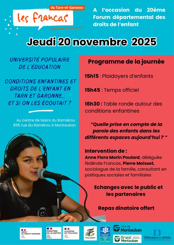 Ce temps, au cours duquel deux intervenants (Pierre Moisset, sociologue et Anne Flora Morin Poulard, déléguée fédérale des Francas) viendront apporter leur éclairage sur les liens entre actions éducatives et conditions enfantines puis échanger avec la salle, permettra de passer un moment ensemble, au profit de nos projets communs.